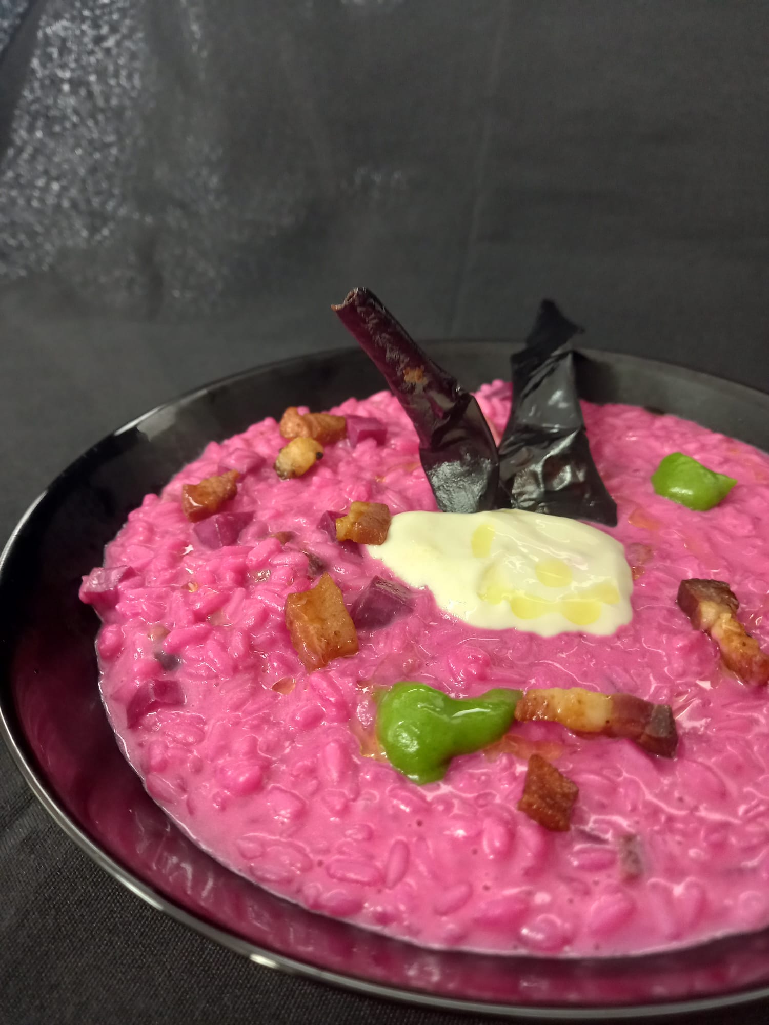 Così ribatezzato da alcuni clienti affezionati, questo riso viene saltato con rape rosse in due consistenze, guanciale croccante e pecorino a pioggia.